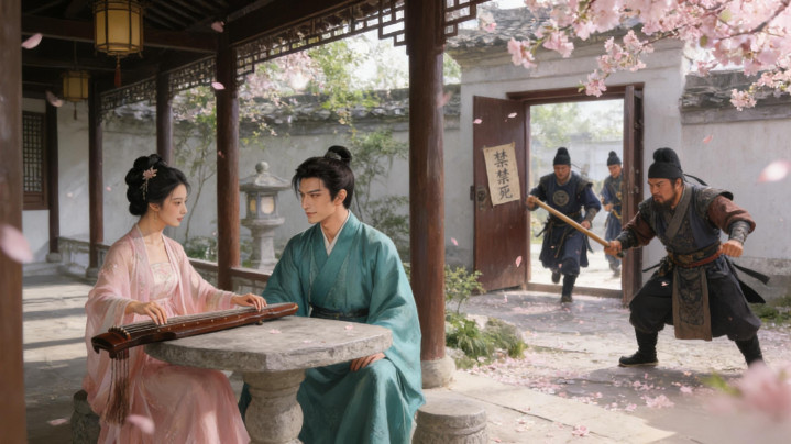 院内的桃花开得正盛,粉白的花瓣随风飘落,落在青石板铺就的小路上,也落在廊下阿谁抚琴的女子身上。