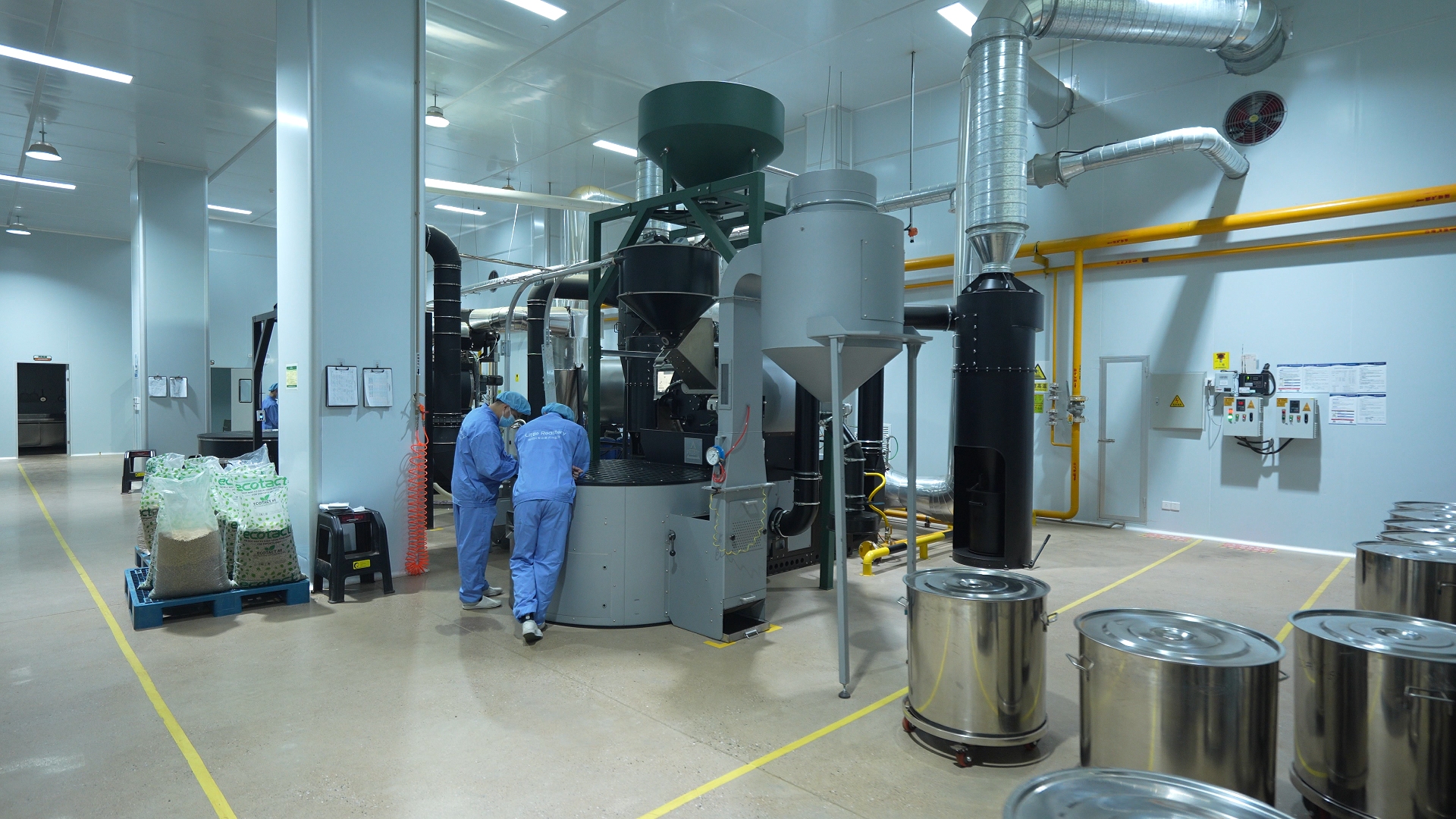 得力咖啡的烘焙厂区,两条从德国引进的世界头部咖啡品牌同源工夫的PROBAT烘焙产线正连接运转。来自巴西、哥伦比亚、埃塞尔比亚等世界各地的咖啡豆进程智能系统完成拼配,先后通过X光机剔除异物、色选机筛除差错豆,再经金属检测,最终留样后,方可走向市集。